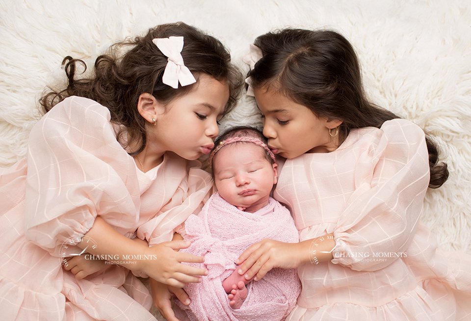 Hello Friends! I am dying to share this newborn session with you, oh goodness, it is one of my favorites from the past year – just look at these kids! This is one of my past clients, and this is their 3rd newborn baby girl! I am so happy to be doing yet another newborn session for them, and I just love how the photos turned out. What a beautiful, amazing family, and these three little girls are just priceless. The sisters are so good with their little one, and the photo gallery turned out just perfect, and to match the past sessions and the art the family have in their home! Mom had a beautiful vision of colors, props, and accessories to match their other pictures, and we totally pulled it off. And, yes, of course I got pooped on (business as usual)! (Check my website for more information on Newborn and Sibling Photography in Herndon)